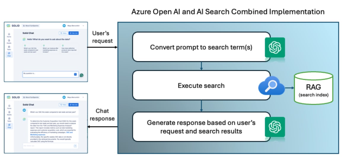 When a user asks a question in our chat, that RAG is searched by the Azure AI Search service to retrieve relevant data assets, and a response is generated using Azure OpenAI (GPT).