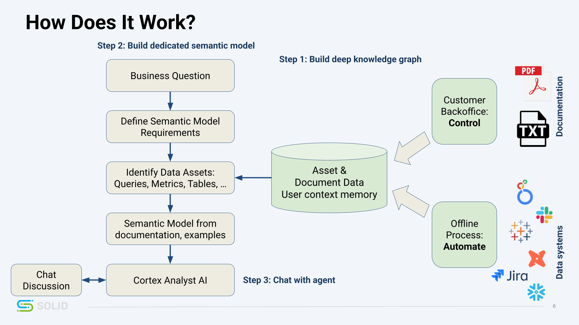As part of this, we’re excited to announce our Just In Time Semantic Model capability for Snowflake. Using JIT-SM, Solid users can generate SQL queries on the fly within Snowflake, through Snowflake Cortex Analyst. The Solid platform generates the semantic model on demand for each query, and then uses it when making a Text2SQL call to Cortex Analyst
