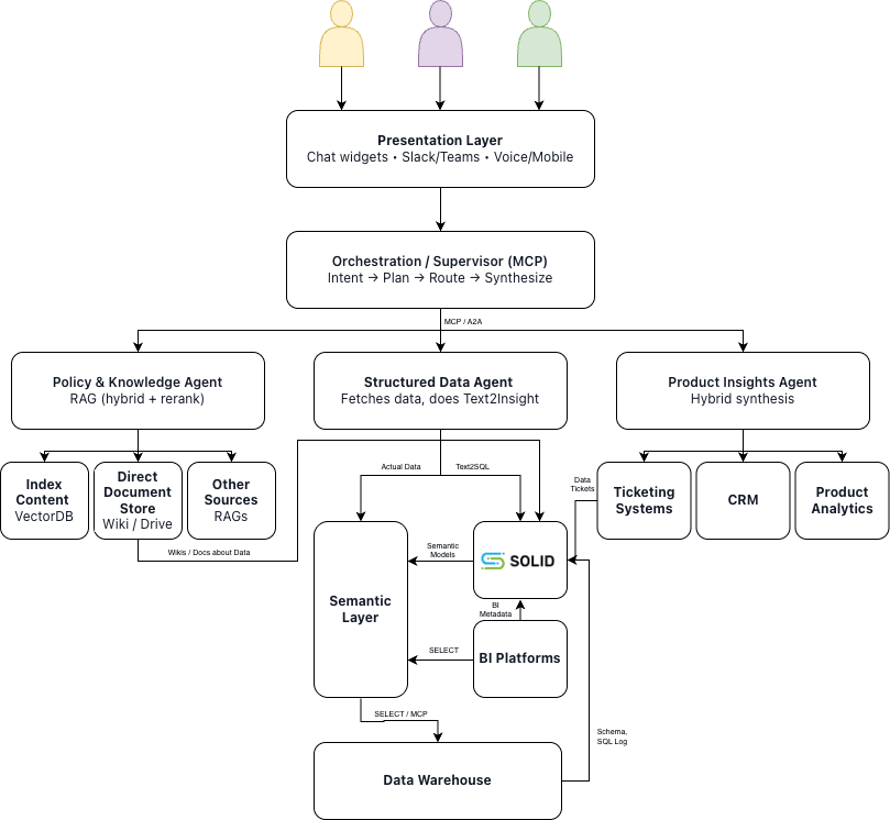 A real foundation. Warehouse or lakehouse for facts (structured data), vector DB for text retrieval, and a semantic layer so metrics are consistent. This is where Solid helps most: we automate and maintain the semantic models and usage-aware metadata that your agents rely on. Without Solid, it will takes many months to get to a fairly basic set of semantic models, which will suffer from accuracy issues and rot.