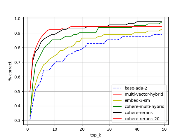 Our journey started, as many do in the AI space, with embeddings. We benchmarked the usual suspects: OpenAI's ada-2 and embed-3-small, alongside Cohere's v4 embed. Just switching up the embeddings gave us a nudge in the right direction, bumping our top-5 accuracy to 70%. A decent start, but not where we needed to be.