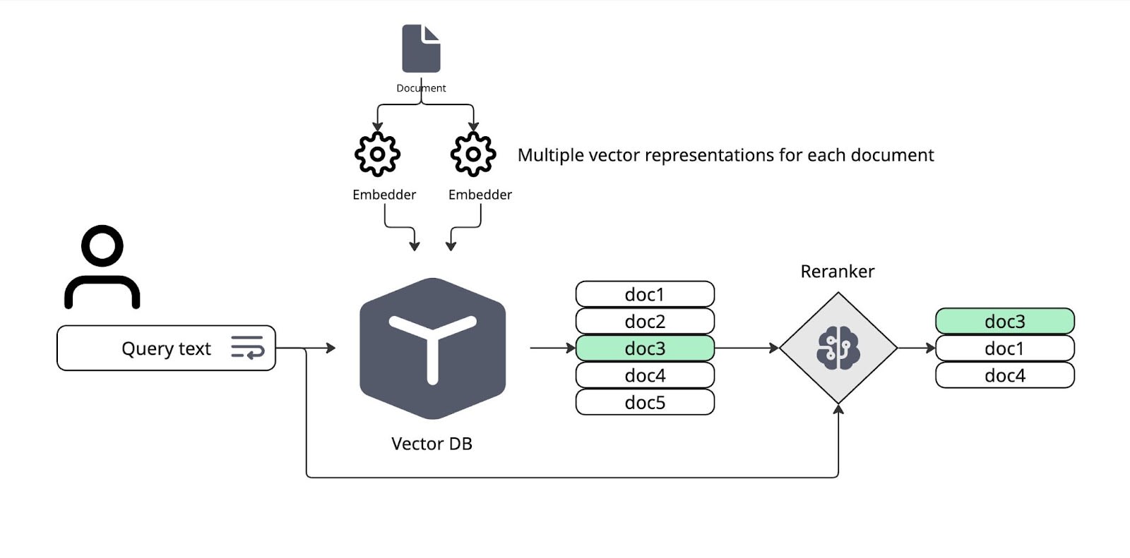 Best practice in RAG search is to have a two stage search where the first stage is a rough filter that uses vector similarity to find decent candidates for the search results, and then the second stage is a Reranker that takes these results and decides based on their actual content which are the best documents to answer the query.