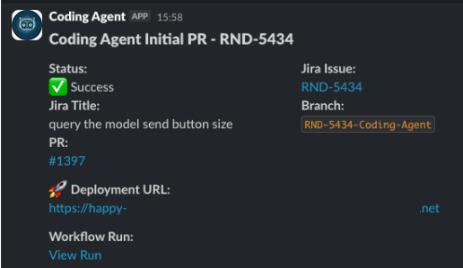 Now the flow became: open Jira ticket, describe the change, add coding_agent label, continue working on meaningful tasks, get notified the flow finished, and come back to a PR with a live preview when you can. No GitHub Actions UI needed. This allowed our product managers and our designers to implement small changes immediately, without knowing how to code.