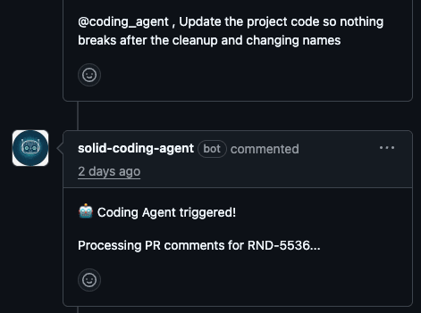 So we added one more entry point: coding-agent-comment-dispatch. This workflow listens to the issue_comment event (which GitHub fires for PR comments too) and checks if the comment body contains @coding_agent.