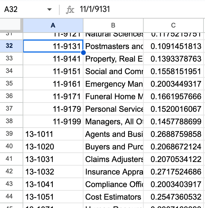 Funny note, the first column (SOC Code) in the Microsoft dataset had the classic “Excel perceives this as a date”, so I had to correct that before doing all my VLOOKUPs in GSheets.