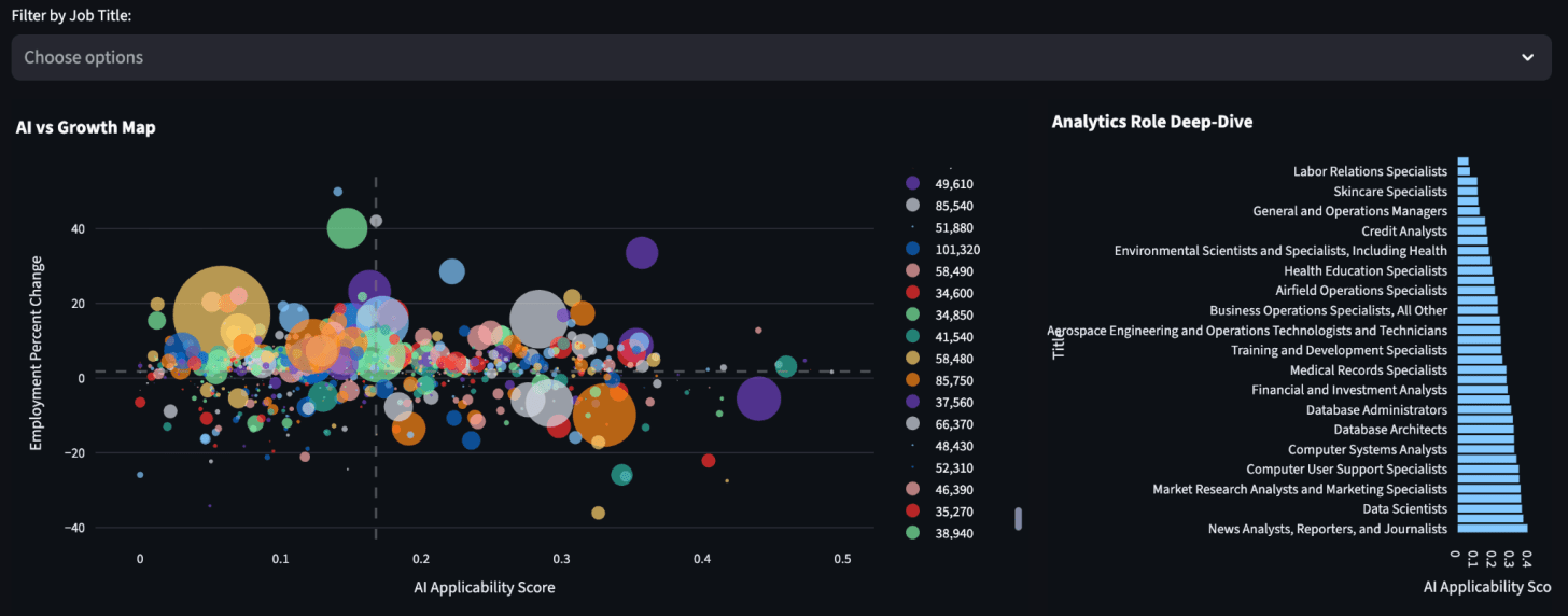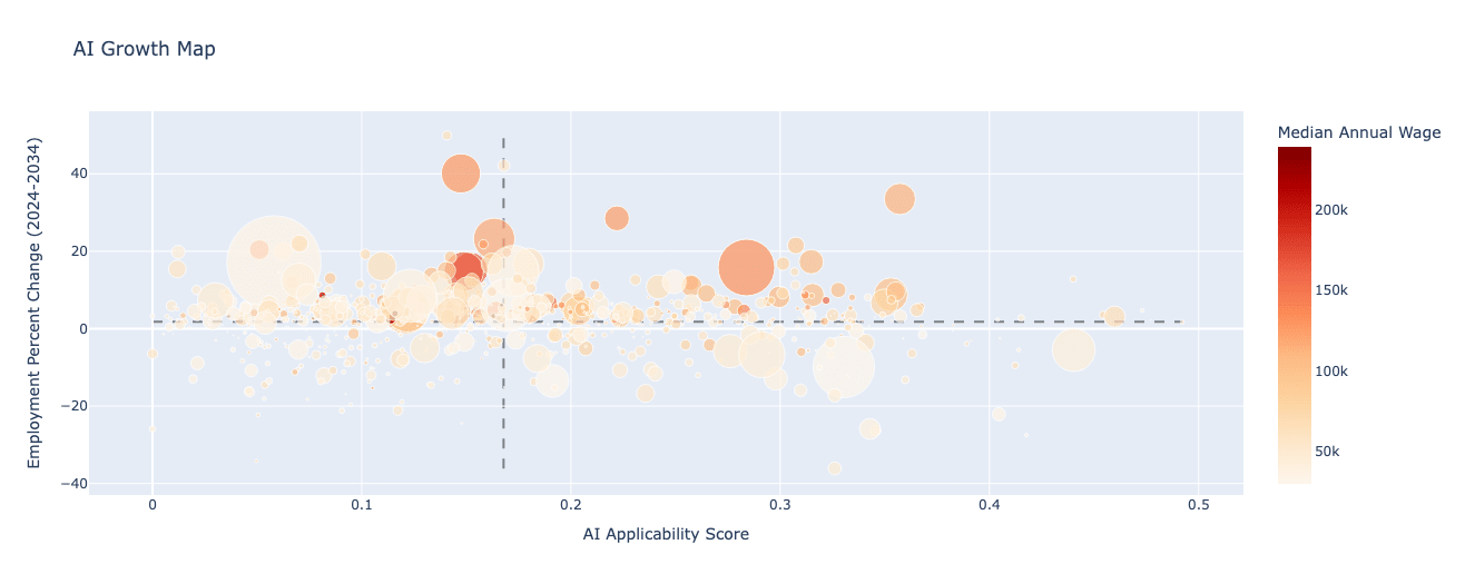 The quadrant chart is the most useful; with the top-right being roles that are high AI applicability and still high growth and top-left being roles with high growth and low AI applicability.