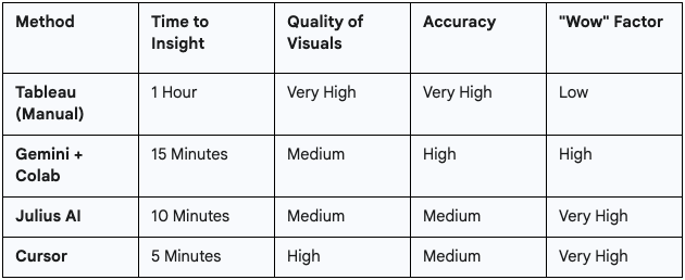 Though, the elephant in the room is… if I spent 3x more time dialing in Julius, Cursor or Colab, it likely would look better than my Tableau dashboard.