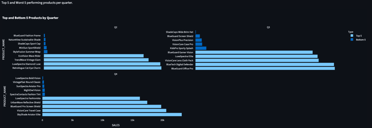 Product Extremes: What are the top 5 and worst 5 performing products for each quarter? (Visual: Horizontal Bar Chart + Table)