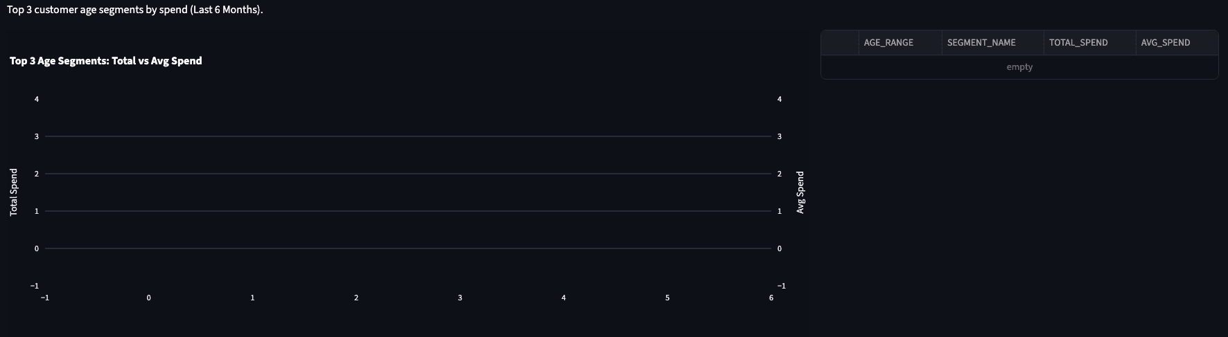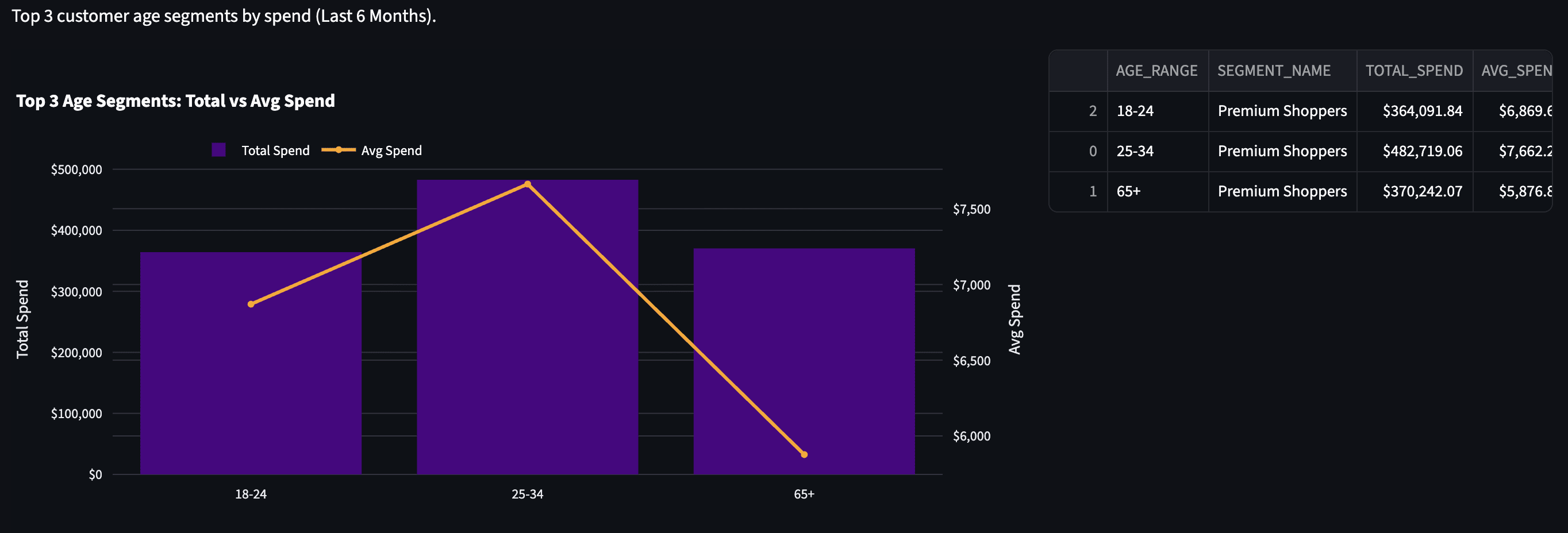 Customer Demographics: Which 3 customer age segments purchased the most in the last two quarters? (Visual: Bar Chart with Avg Spend Line + Table)