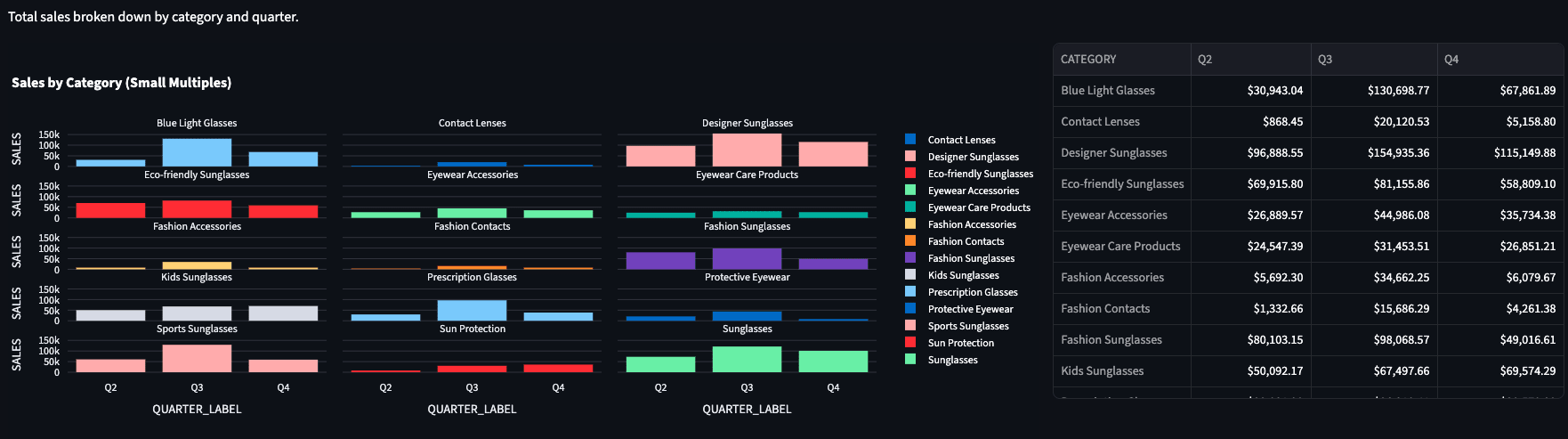 Quarterly Performance: What are the total sales, broken down by category and quarter? (Visual: Small Multiples Chart + Table)