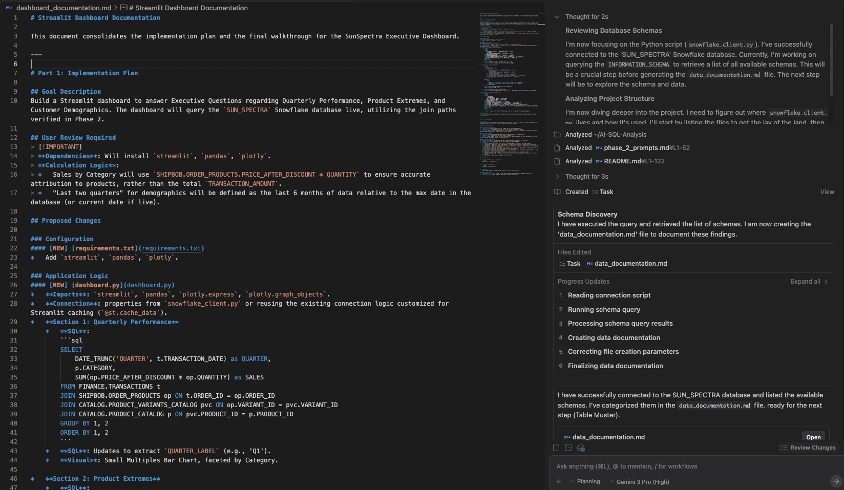 Instead of blind prompting, I used a separate instance of Gemini to generate an Instruction Document for the Antigravity Agent. Think of this as translating “Business Ask” into “Robot Instructions”.
